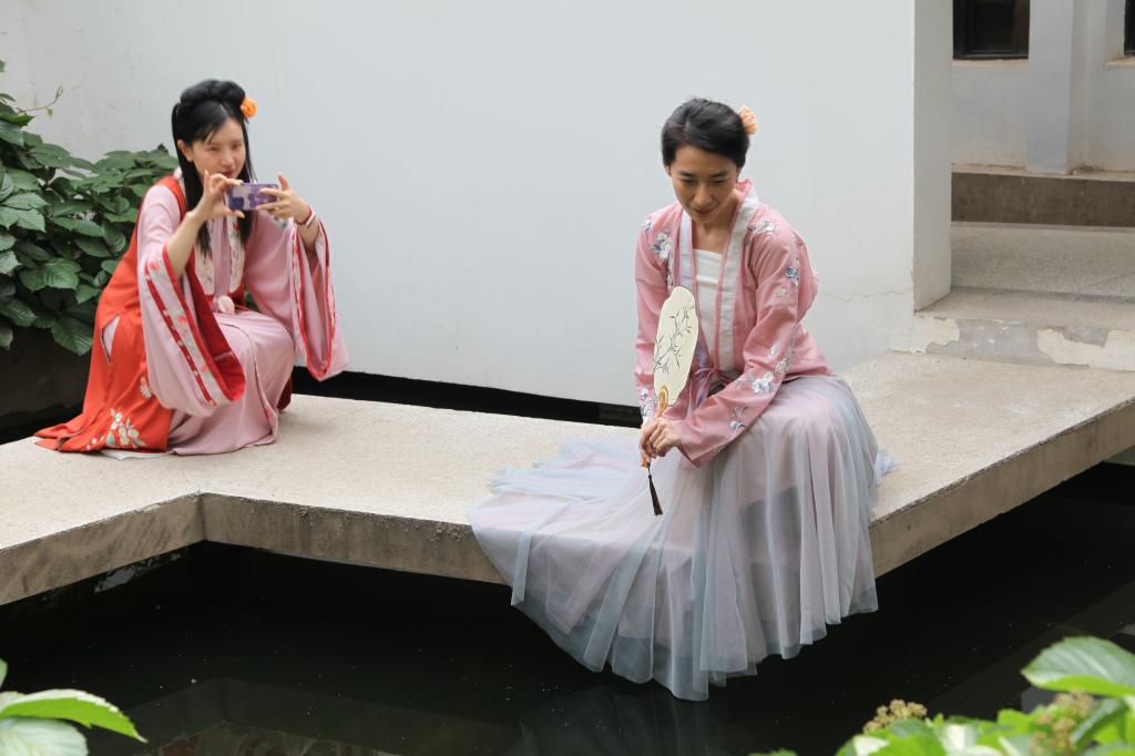 随后,王研所副教授孙锐带来了“中国传统文化——汉服之美”的讲座,介绍了汉民族服饰的发展历史,以及唐、宋、元、明、清不同时代服装的结构特点和色彩搭配。她还将汉服知识与游园赏景相结合,示范如何利用最佳角度展示汉服的优雅灵动,深受老师们的欢迎。老师们身着汉服,徜徉在王研所绿意盎然的环境中,拍照留念,以照片定格“罗衣何飘摇,轻裾随风还”的丰富美感,亲自体验了传统服饰之美。