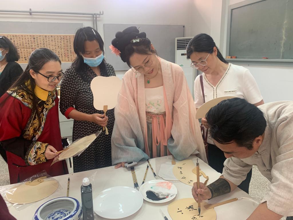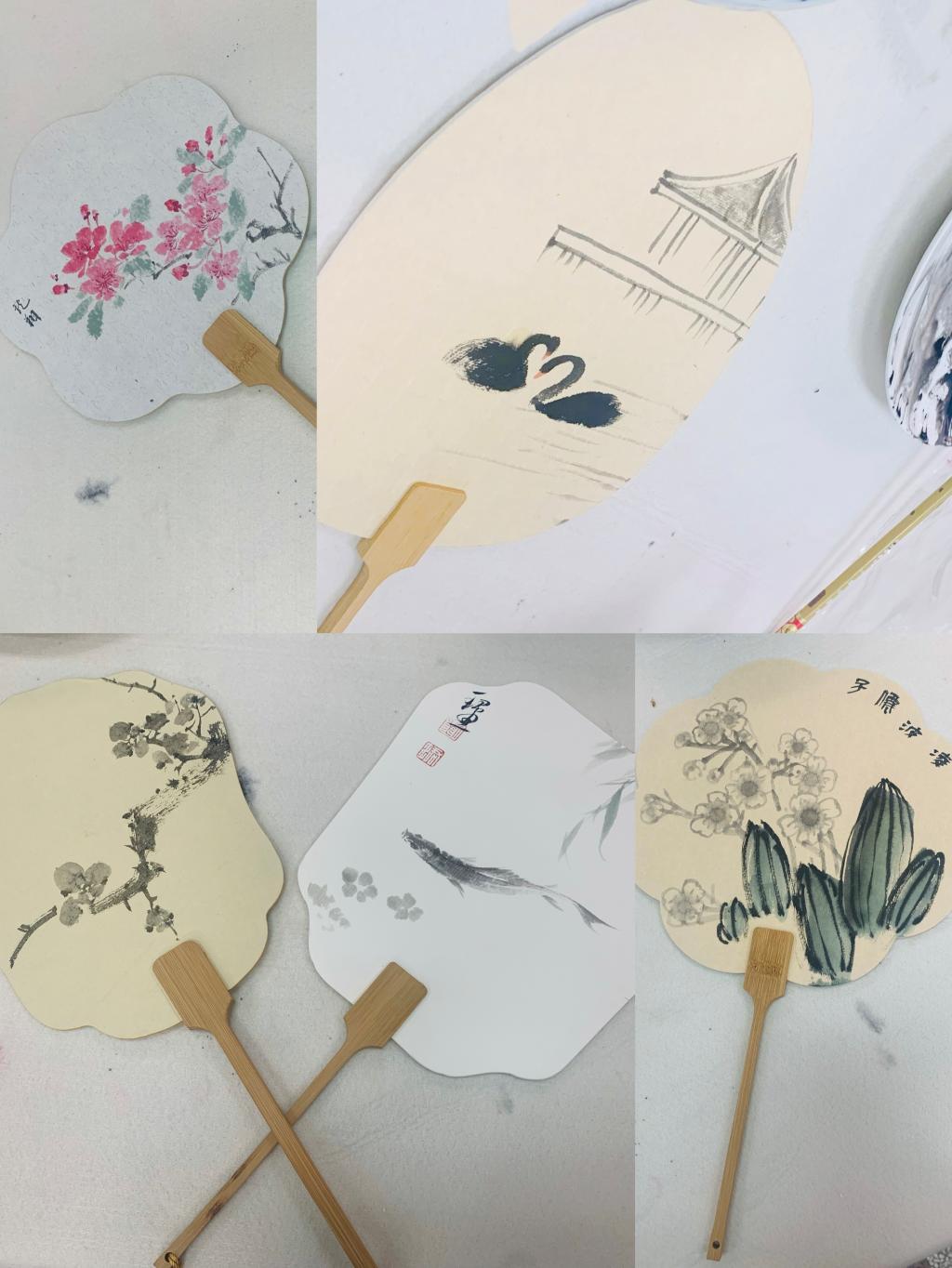 在书画创作体验环节,王研所副教授孙列、刘珺带领老师们认识传统绘画形制,感受笔墨韵味和书画艺术精神,指导他们参与绘画实践。老师们在准备好的扇面上自由创作,花鸟游鱼、梅兰竹菊以及校园的求是亭、小天鹅等元素都跃然呈现在老师们的笔下,雅趣横生,情致盎然,在欢声笑语中感受了书画艺术之美。