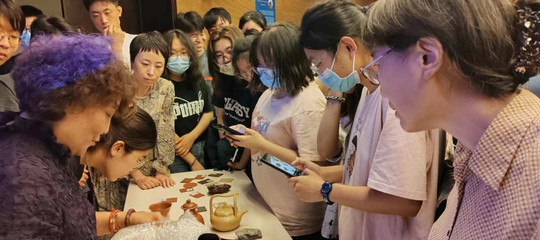 在讲座期间,于富春老师拿出多份紫砂片样品和“现代文物”的紫砂壶与现场师生分享鉴别的技巧,如何鉴别紫砂老壶?如何鉴定五色兼备的宜兴紫砂原矿?紫砂原矿的微量矿物元素对人体有何益处?主讲人详细解读了宜兴紫砂的奥妙。老师和同学们纷纷上前通过观色、触摸来体会品类繁多的紫砂陶器并与专家交流学习。