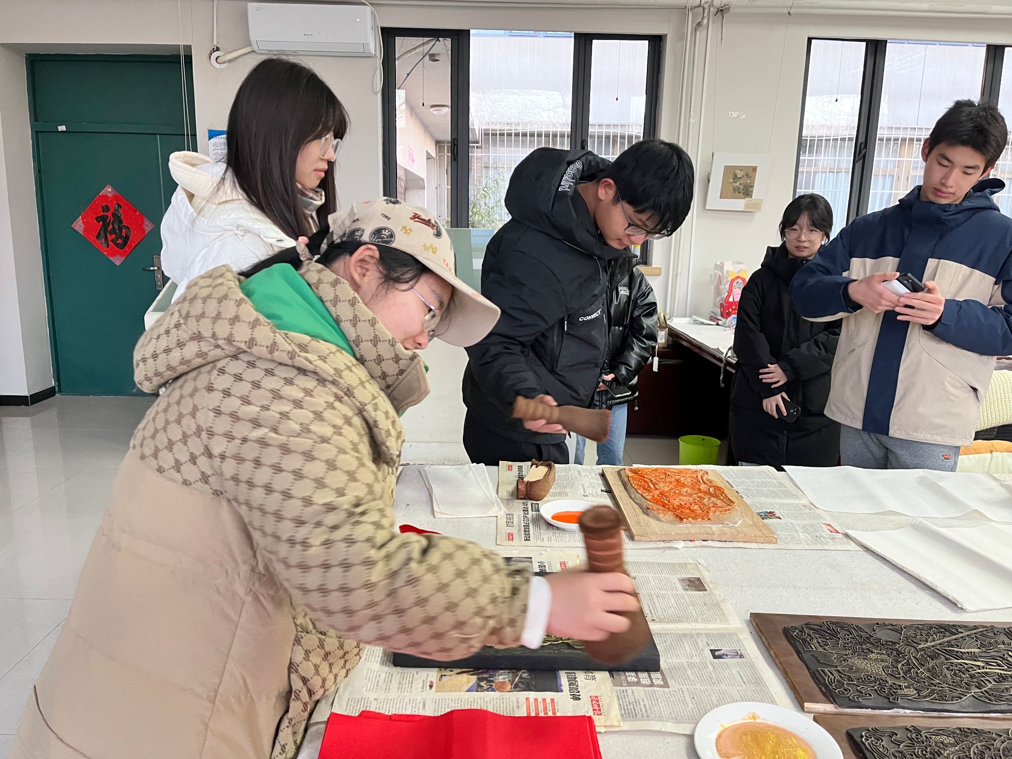 副教授王坤为学生准备的“年画赏析与拓印”,不仅让同学们更加深入地了解年画的创作过程、艺术特色和价值意义,还带领他们亲自尝试年画的拓印和绘制,激发大家对中华文化的兴趣和热爱。同学们纷纷尝试拓印技术,对自己印制的年画爱不释手,进一步感受了年画的艺术魅力和文化内涵,增强了对民间艺术的敬畏。