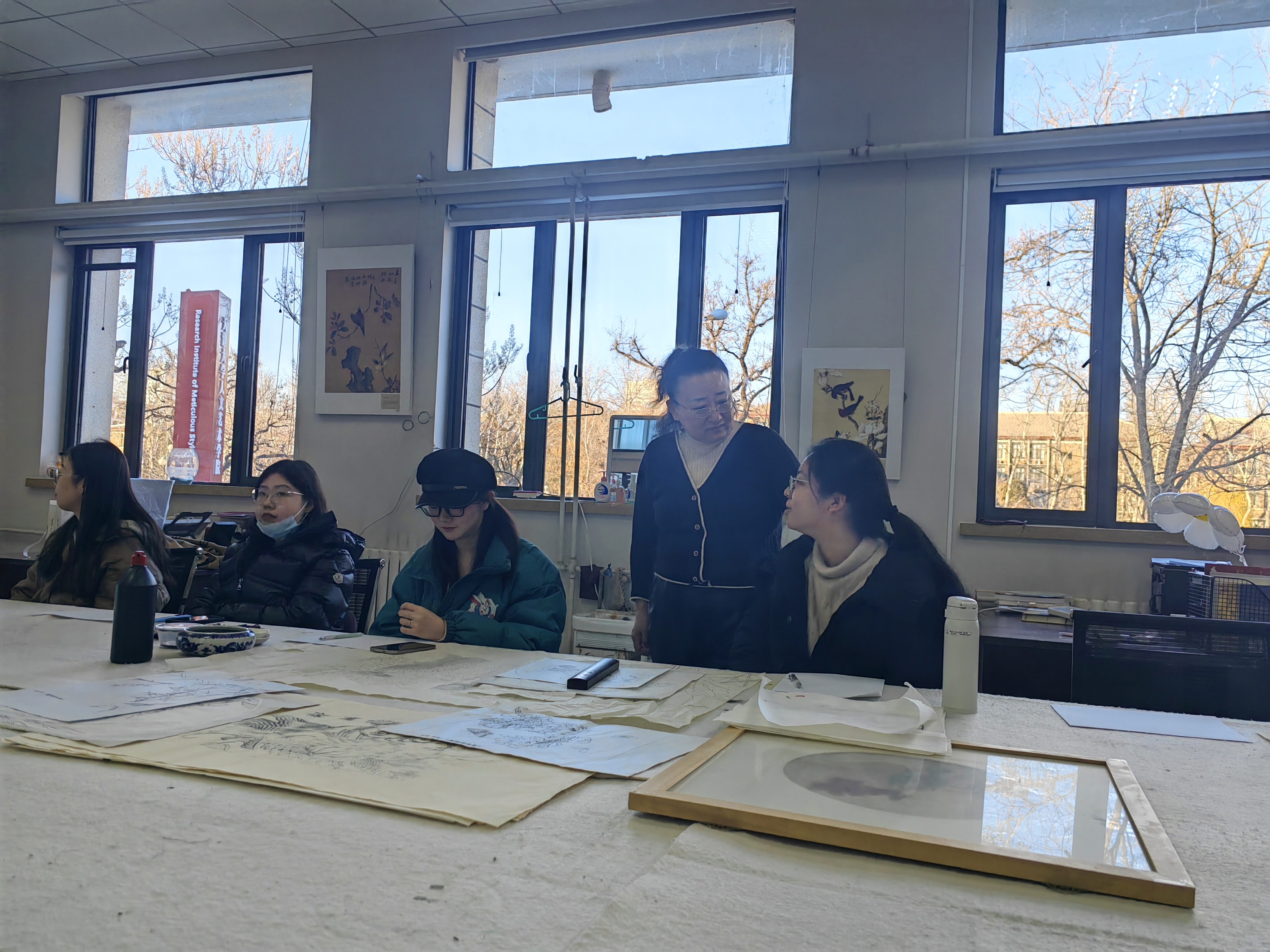 为迎接新年,工笔重彩研究所副教授曹铁娃为同学们带来“什么是美”的主题分享。她带领学生参观了工笔所历代工笔重彩绘画高清仿真展和口袋展廊优秀年画作品展,引导同学们边欣赏边讨论。