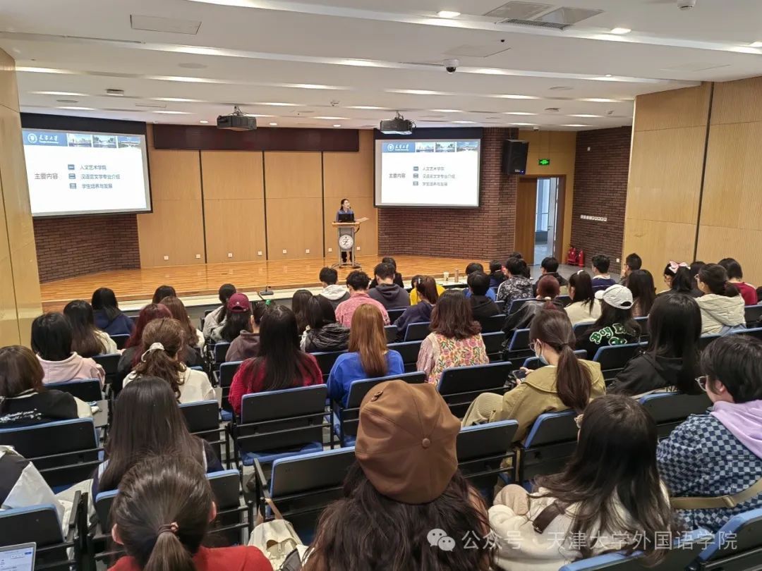 中文系主任张黎明为同学们作了汉语言文学专业介绍。汉语言文学专业注重守正与创新,与人工智能、新闻传媒、艺术等学科交叉融合,打造“语言学+人工智能”“文学+中国之治”“艺术+文遗保护”三大特色方向,以培养学生的综合能力和创新精神。张黎明着重介绍了两方面内容。一是我校汉语言文学专业发展现状。汉语言文学专业自1998年首次招生,现已发展为天津市一流专业建设点和中国语言文学一级学科硕士点。近些年来,汉语言文学专业在教学和科研中屡获佳绩,获评国家级一流本科课程两门,获批第三批国家语言文字推广基地,主持国家级社科基金项目10余项,省部级社科项目20余项。二是汉语言文学专业在学生培养与发展方面的相关举措,在课程设置上形成了三大体系:核心课程、特色课程和个性化选修,以及贯穿整个培养阶段的各类实践教学。张黎明表示专业选择涉及各方面因素,同学们可与班主任、师友导师、各任课老师多交流,老师们也很愿意为大家“解疑答惑”。
