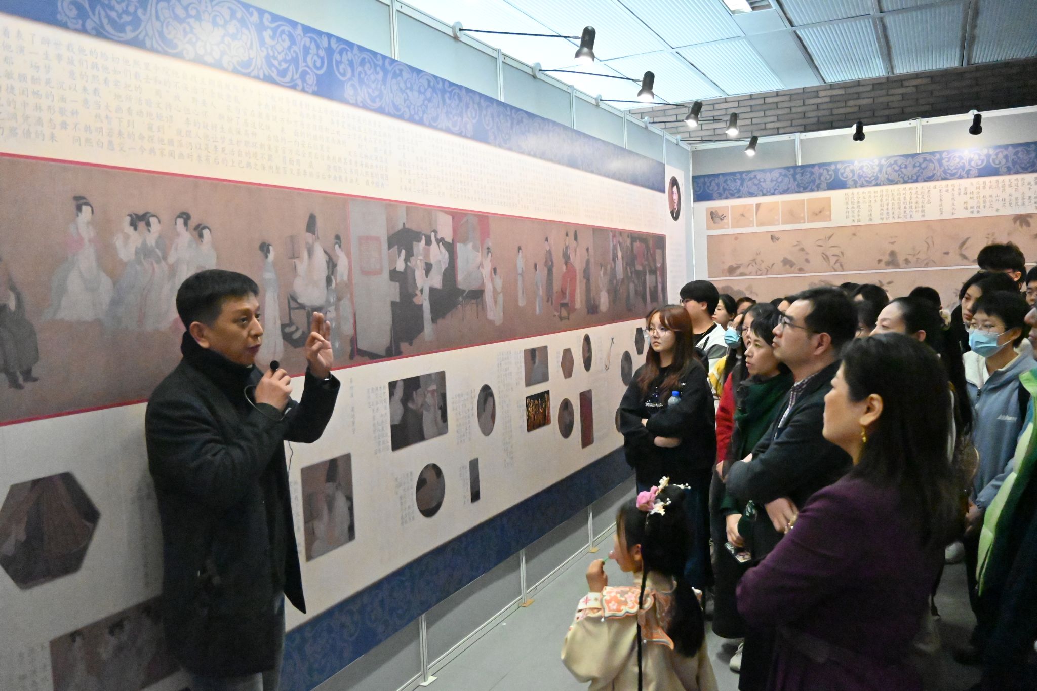 品鉴会课程讲授环节,师生共同踏上文化艺术之旅。现场展示的《韩熙载夜宴图》《清明上河图》《百花图卷》《富春山居图》中国画经典名作图板,被详细圈注了学习鉴赏要点及艺术创作概要。