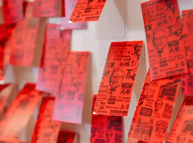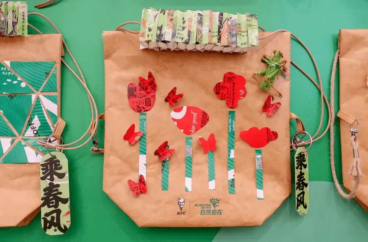曹铁娃带领学生创作了三幅环保壁画《自在花园—绿色森林循环》《天津快板说环保》《无穷地球,无限循环—天津麻花喊你做环保》。作品主创高子星同学、何佳怡同学、谭加奇同学介绍说,这次活动的全部作品都是用肯德基废弃包材杀菌消毒后进行手工剪裁、折叠拼贴而成。吃肯德基的时候,偶然发现肯德基经典牛皮纸包装袋通过不同的折叠角度能够形成不同容纳空间,自在花园这幅作品就以此为灵感,通过废弃纸袋包材不同程度的折叠形成比例各异的三角形,根茎则由肯德基全家桶的桶盖裁剪插接而成,组成五朵环保之花。环保之花组成的自在花园希望传达KFC自然自在的环保理念和全球战塑的环保主题,用这样一个别致的花园传达对于环保的美好愿景。《天津快板唱环保》和《环保地球-无穷循环》则通过阵列排布,通过天津快板和天津麻花这类本地元素宣传环保。