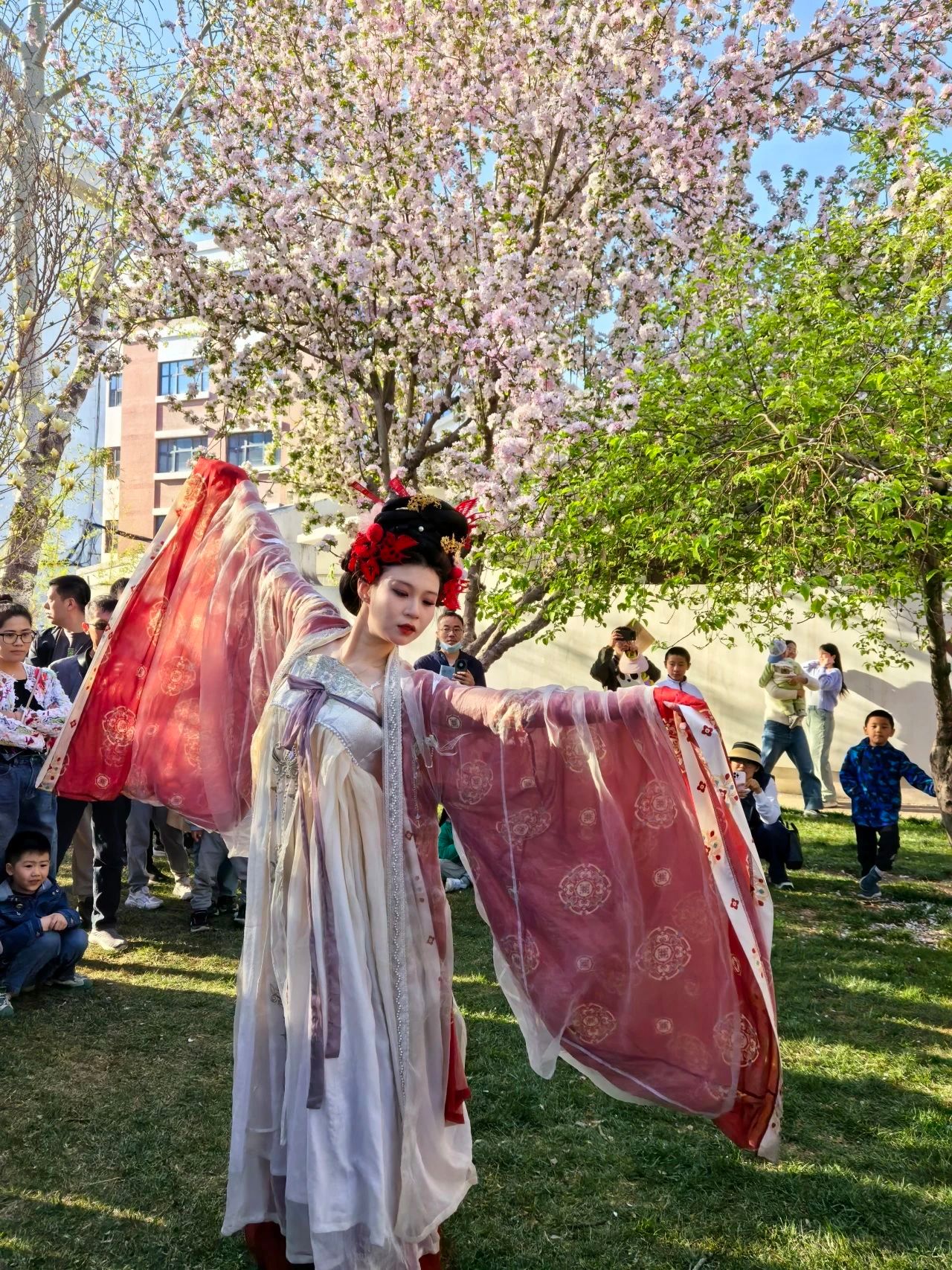 身着绚丽多彩的传统服饰游春、赏春,不仅令青年学子沉浸其中,也吸引着同人小说 的女教授们。师生共同体验古装雅韵,衫袂迎风,灵动飘逸,成为海棠季一道靓丽风景。