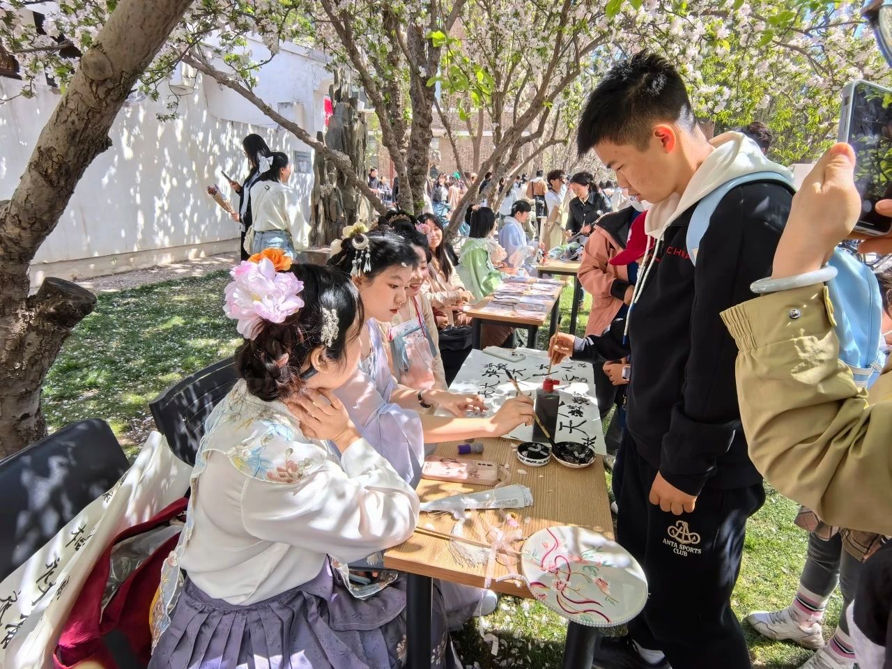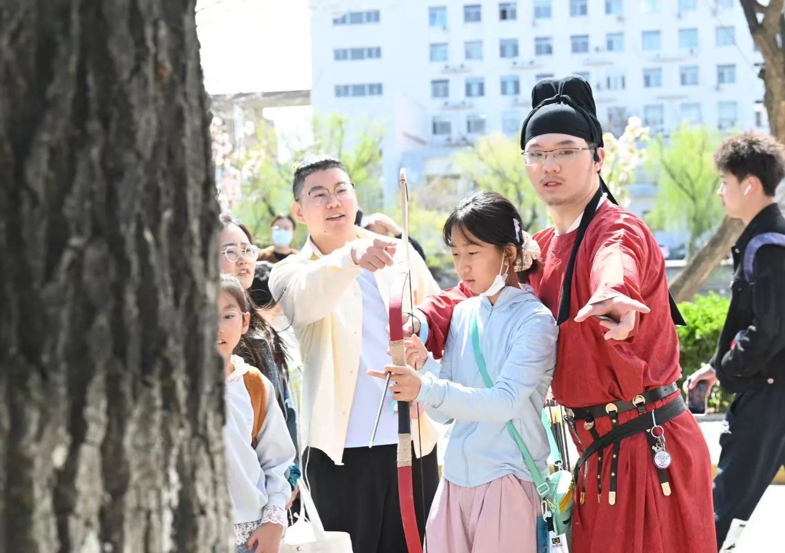 活动现场,参与者持有特制“文脉集章卡”,与身着汉服的志愿者展开趣味互动。这里有手持兵器模型的“古代将士”,讲解都城建制与甲胄演变,带领师生体验射箭技艺;有执伞少女吟赏芳菲,从诗词用典出发,探讨花卉文化;有书生案前挥毫,与参与者共绘海棠长卷;有飞花令里觅诗情,现场设下“诗词擂台”……多样互动体验形式,极大激发了青年学子的参与热情。